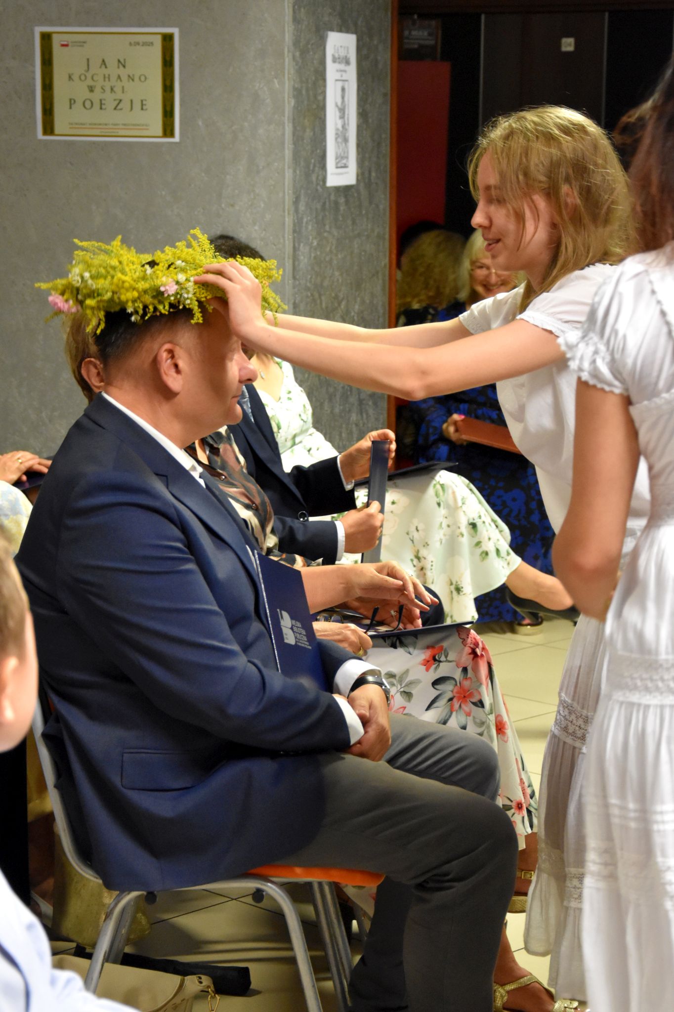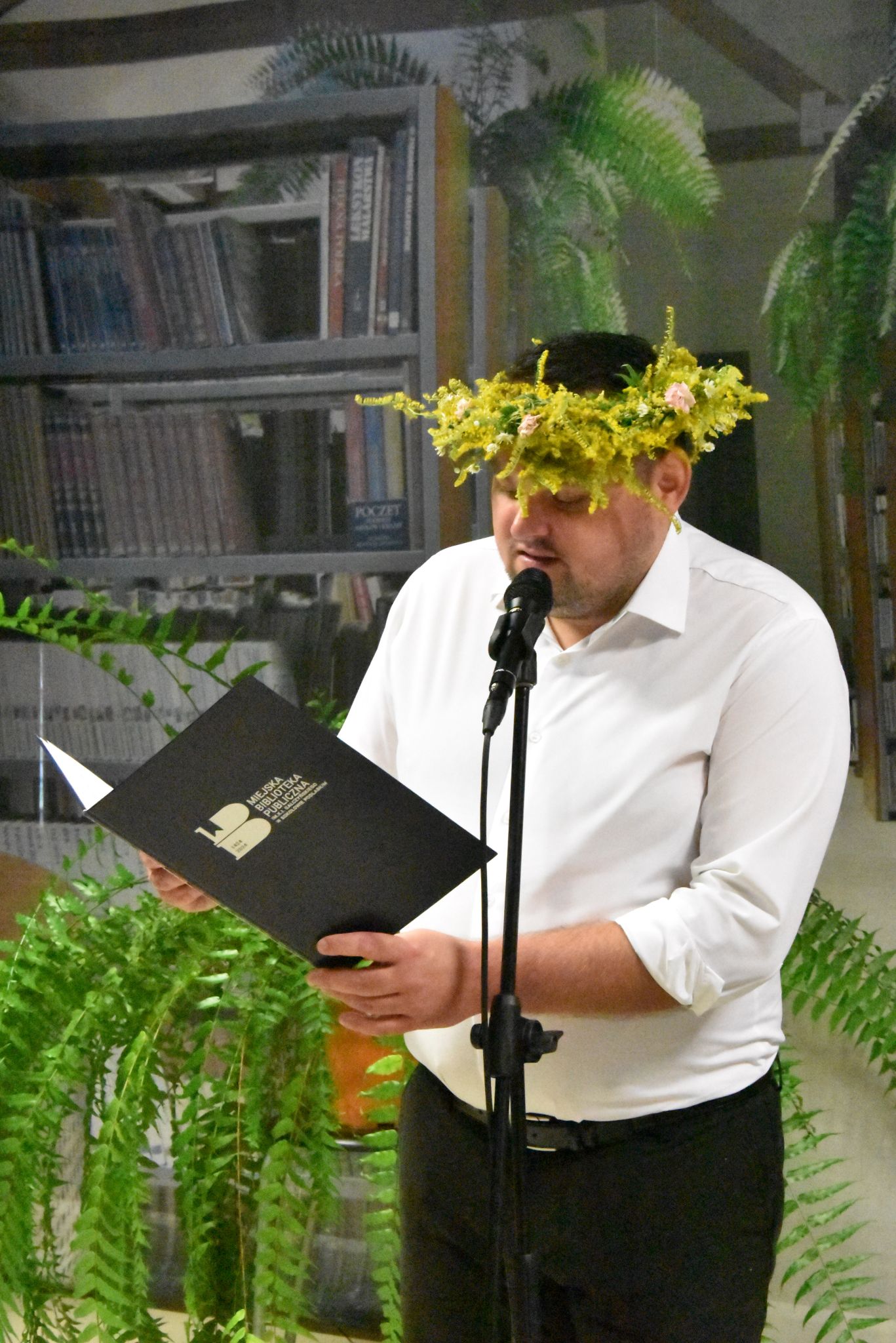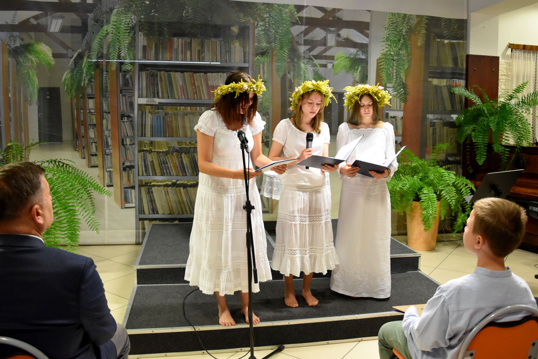 Dzieci i Młodzież z Bibliotecznej Grupy Teatralnej „Wiraż” – Franciszek Kryszczuk (narrator), Agata Kwapisz, Oliwia Flakowska, Wiktoria Pomarańska przeczytali fragmenty „Pieśni Świętojańskiej o Sobótce. Po występie dziewczęta ofiarowały wianki wybranym mężczyznom.