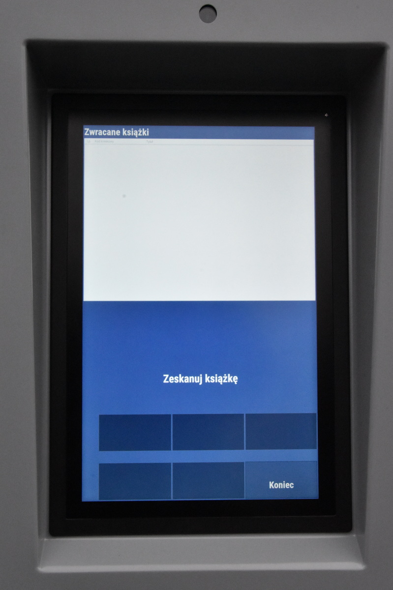 Aby dokonać zwrotu wypożyczonych materiałów bibliotecznych należy na dotykowym ekranie wybrać opcję ZWRÓĆ, następnie czytnikiem kodów kreskowych zeskanować kod kreskowy znajdujący się na karcie bibliotecznej. System pozwala także na ręczne wpisanie kodu.